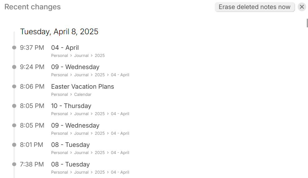 - Deleted notes will also be listed here, at their time of deletion. Press the Undelete link next to them in order to recover them.