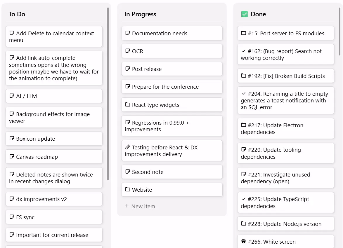 displays notes in columns, grouped by the value of a label. Items and columns can easily be created or dragged around to change their status.