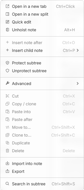 - Same as Insert note after, but the note will be created as a child of the selected note.