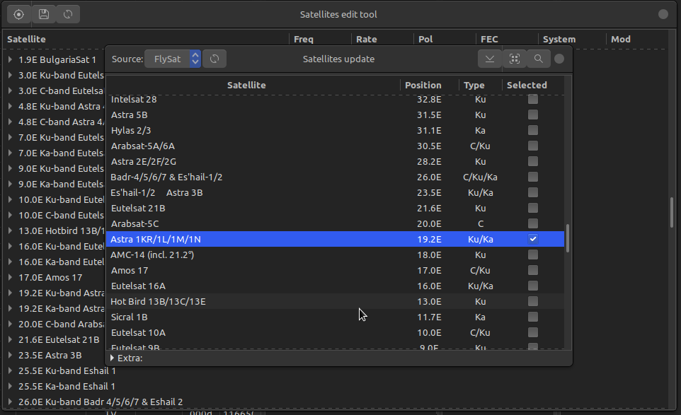 - Ctrl + S, T in Satellites edit tool for create satellite or transponder.
